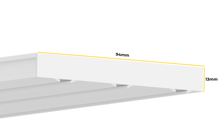Co ważne, karnisz szynowy trzytorowy jest dostarczany jako dwa elementy (szyna jednotorowa oraz dwutorowa), które łączy się ze sobą przez wsunięcie w boczne zaczepy. Takie rozwiązanie ułatwia logistykę, a po prawidłowym złożeniu daje spójny system o szerokości 94 mm w przekroju. Dodatkowo szyny mogą przylegać do ścian bocznych, więc montaż w obrębie wnęki nie wymaga pozostawiania odstępów „na zapas”.